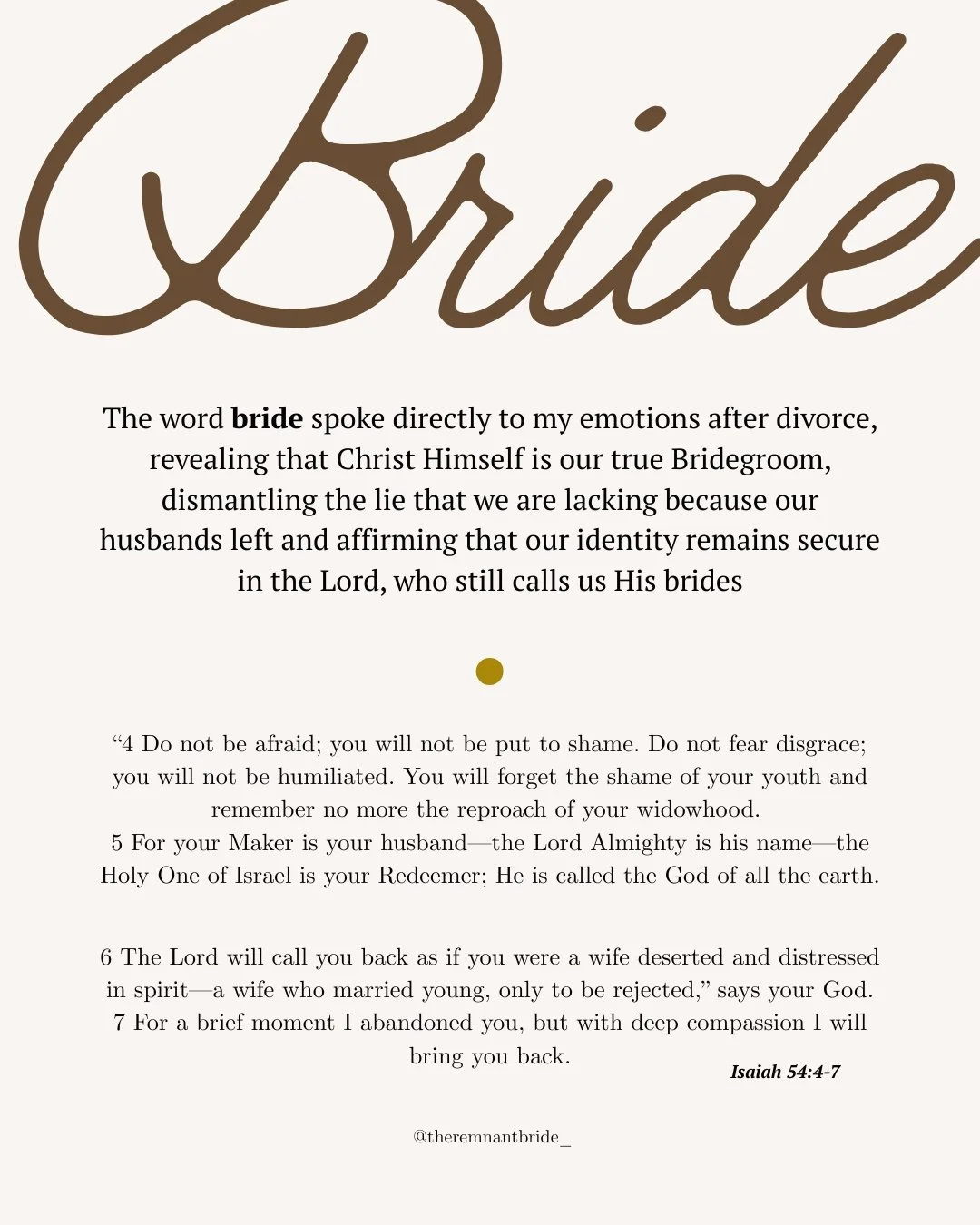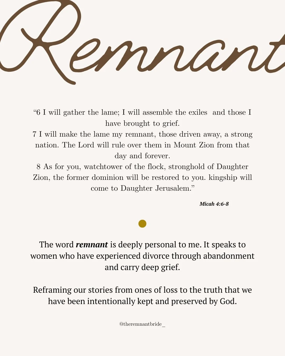 The Remnant Bride comes from Micah 4:6–8, where God promises to gather the wounded and make them His remnant. “Remnant” means the survivors left after destruction. Through this remnant, God will rebuild, reign, and redeem. Many women have had earthly coverings broken or taken away, but all remain the Bride of Christ.